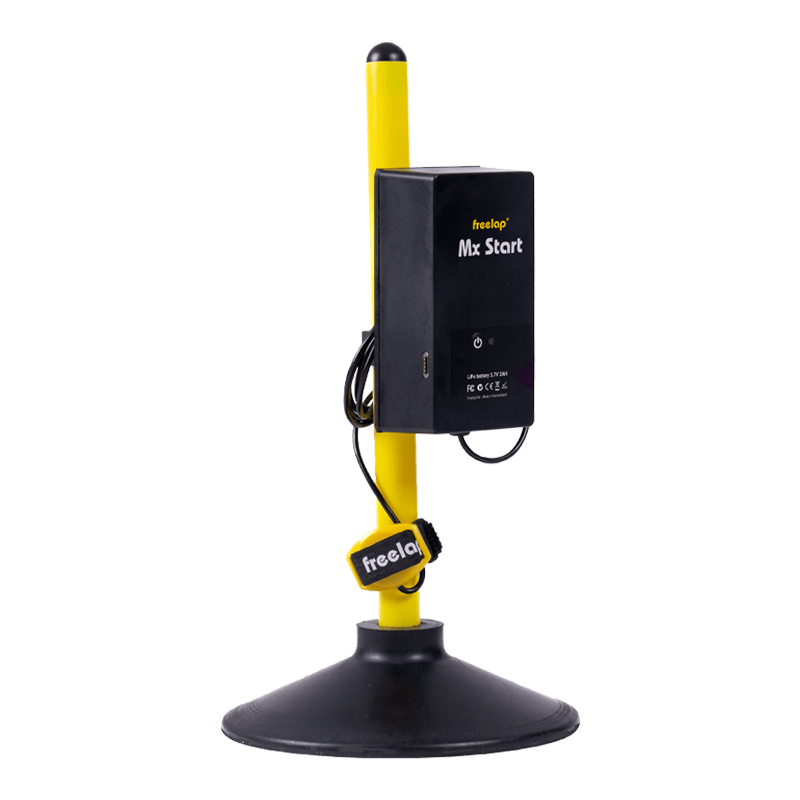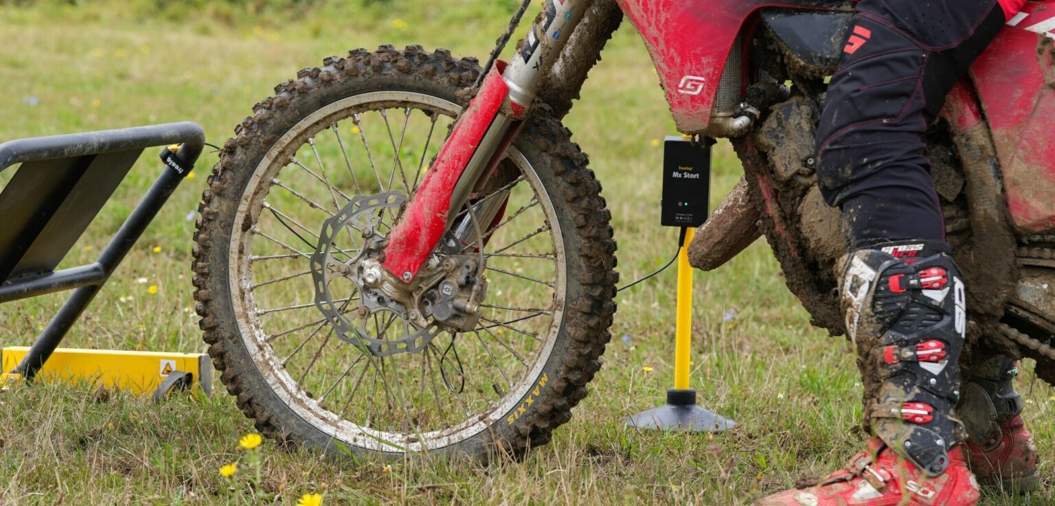 O Mx Start é o transmissor Freelap especialmente projetado para partidas com gate de largada em motocross. Quando o portão de largada toca o solo, o Mx Start aciona instantaneamente o temporizador do transponder com uma precisão de 0,01 s.
